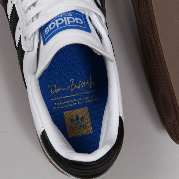 Novinka z kolekce Adidas Skateboarding, která vychází z oblíbeného modelu Dennise Busenitze s názvem Samba. Speciálně navrženo na skateboarding. Svršek je z odolné hladké kůže, špička zesílena o semišovou vrstvu. Příjemná podšívka z polyuretanu, cupsole vulkanická podrážka, tvarovaná EVA stélka, heel cup na ochranu a stabilizaci paty a pro větší pohodlí ještě polstrovaný GEOFIT® lem patky a jazyk. Zapuštěná přední očka u tkaniček a z boku zlatá signatura Busenitz a tři černé pruhy adidas. V balení jedny černé tkaničky navíc.