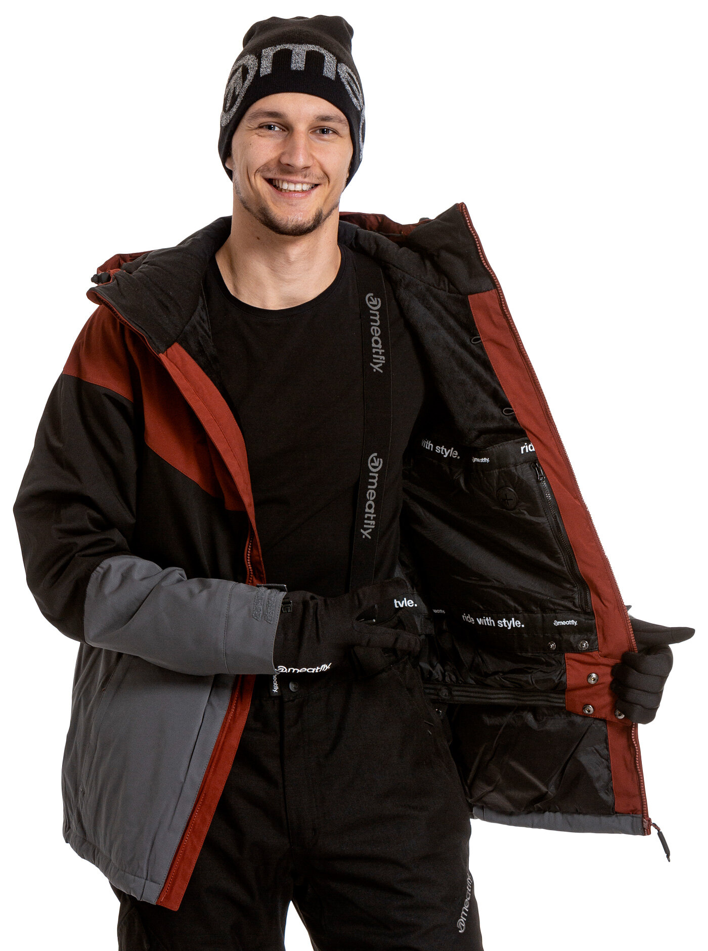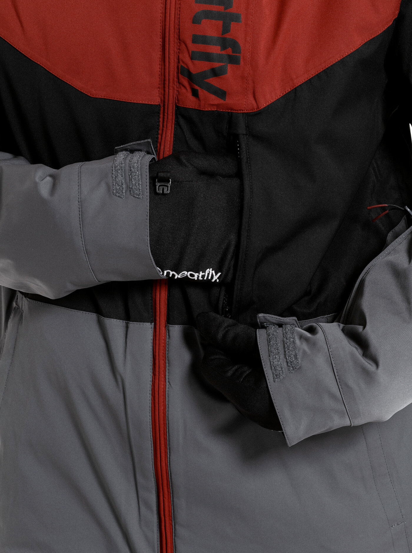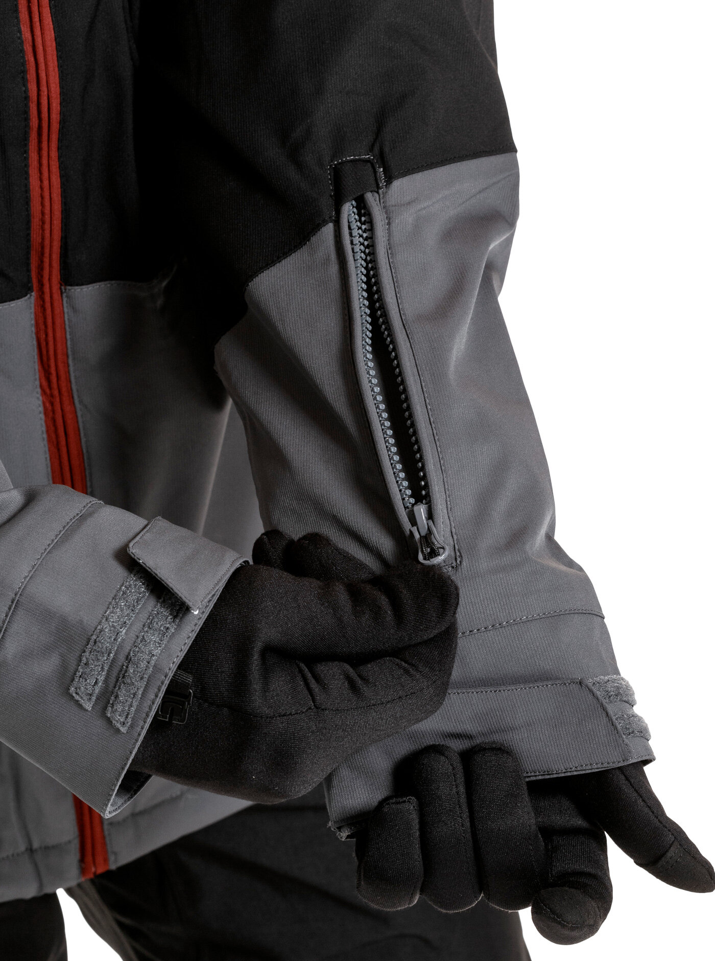 rukávy jsou zakončeny elastickým návlekem s otvorem pro palec a nastavitelnou manžetou na suchý zip